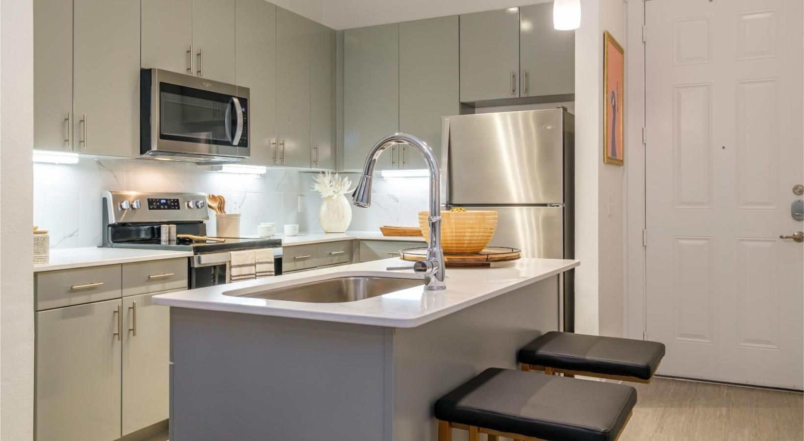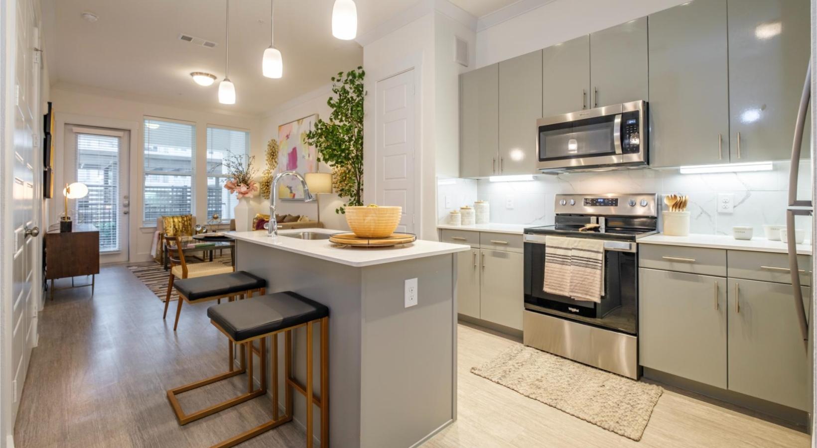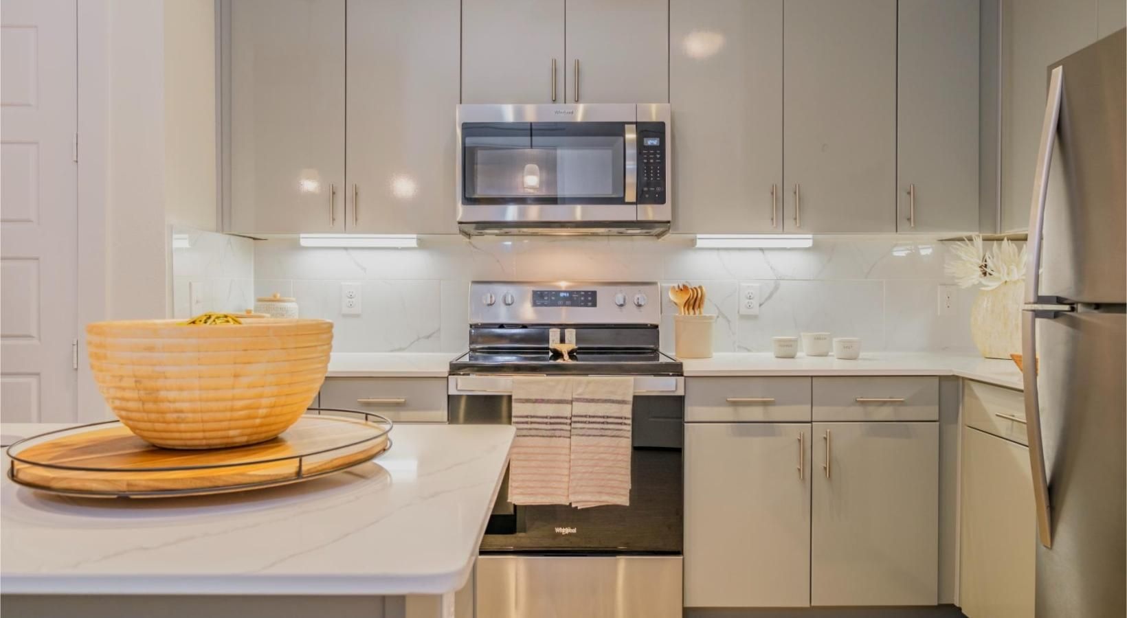 Peruse our gallery to find your new home in our South Grand Prairie apartments. Enjoy smart entries, environmentally friendly thermostats, and walk-in closets with custom wood shelving. Prep savory meals in the Epicurean kitchen with stainless-steel appliances and stylish cabinetry, then treat yourself to some pampering time in the bathroom with quartz countertops and garden tubs. Relax your muscles in the saltwater pool, bask in the sun on the expansive tanning deck, or join the conversation with neighbors at the outdoor fireplace. Visit the resident lounge with HDTV entertainment or try your billiards backhand at the game room. Benefit from a pet park & spa, private one-car garages, a business center, and a 24/7 fitness center outfitted with free weights and CrossFit stations. Our homes for rent in Grand Prairie are nearby a hub of entertainment. Take a stroll to Joe Pool Lake or some fun at Epic Waters Indoor Park, Urban Air Trampoline Park, and Fort Worth Zoo. Book a tour!